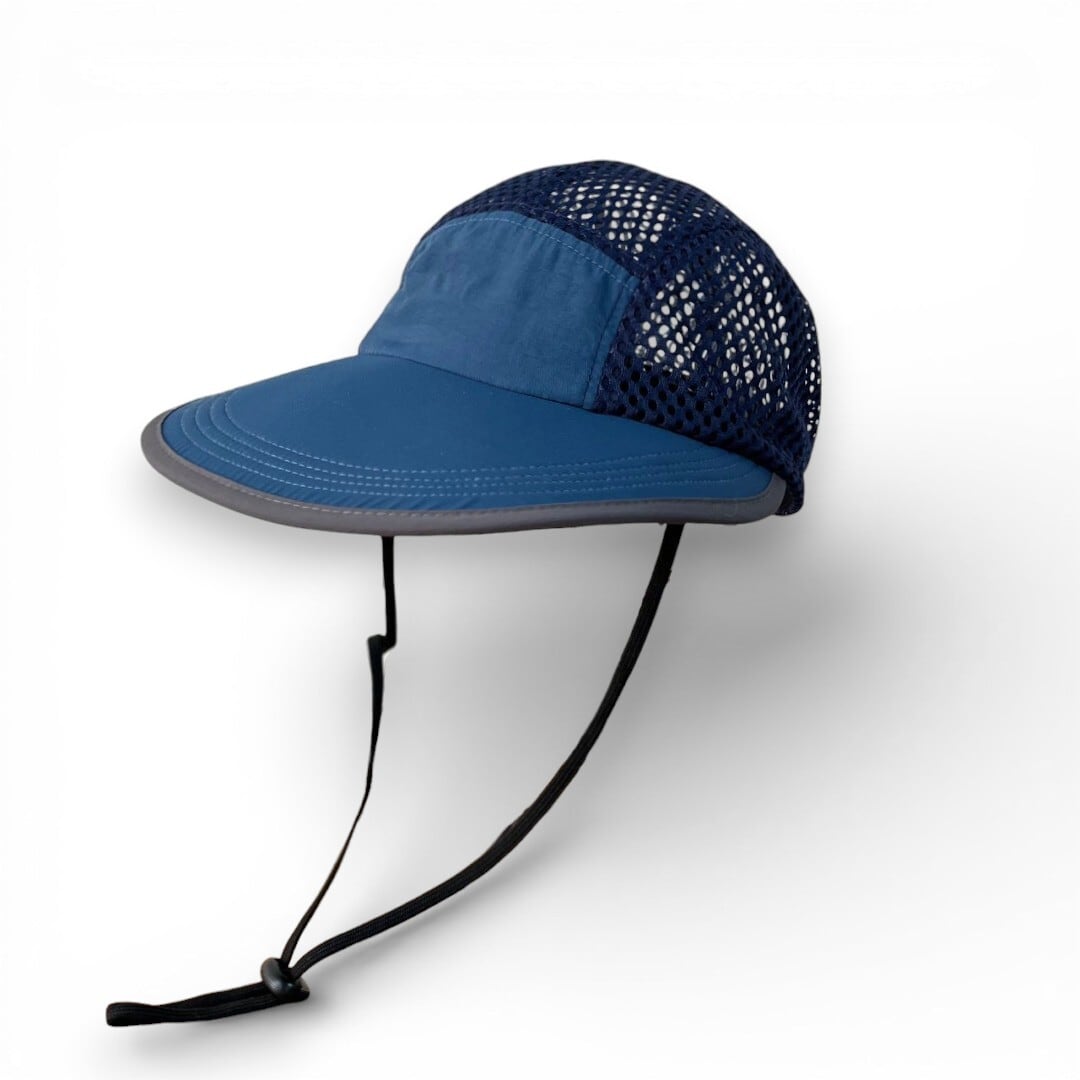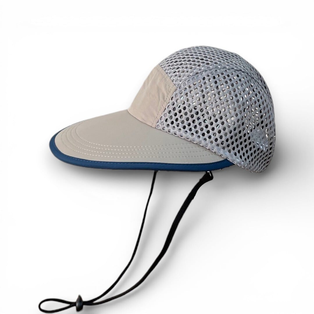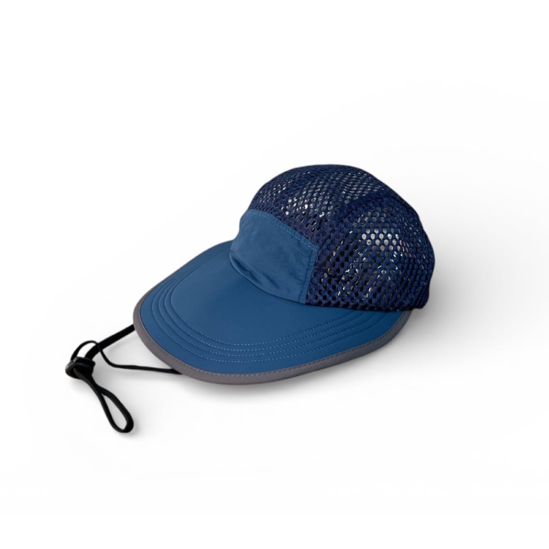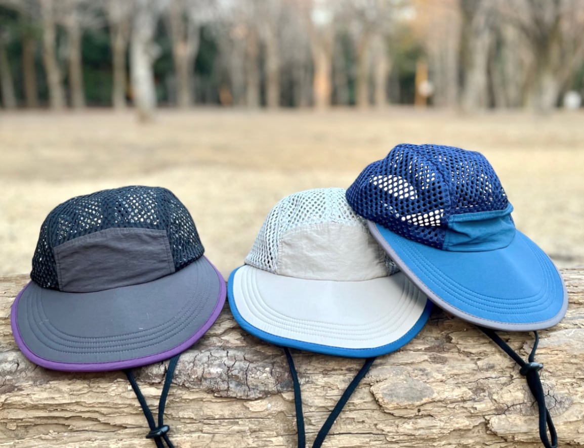 顔全体を広範囲で日差しからガードする幅広つばが特徴のキャップ。